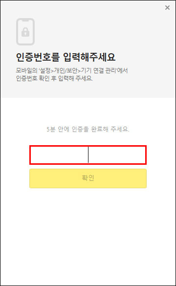 둘 중 하나를 선택하게 되면 본인 스마트폰의 카카오톡으로 인증번호가 전송됩니다. 5분 이내에 확인하고 인증번호를 입력해 주어야 인증이 완료됩니다.