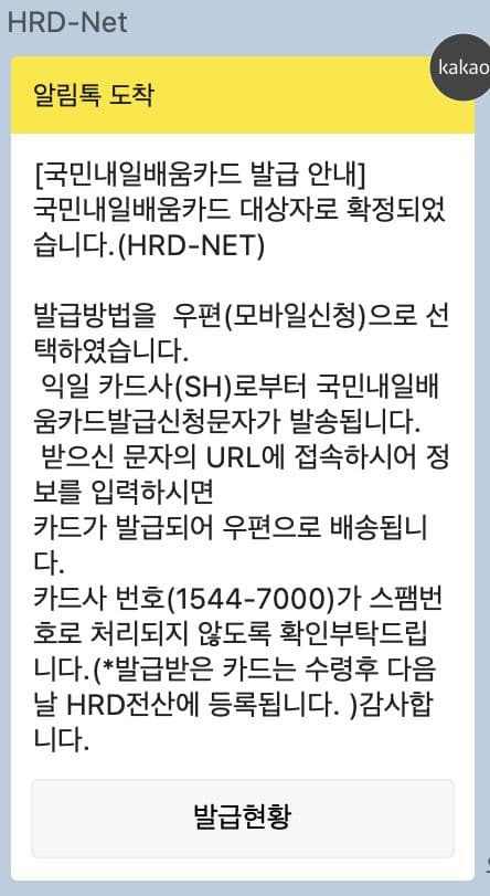 신청을 정상적으로 마치면, 1~3영업일 내에 아래와 같은 대상자 확정 문자를 받으실 수 있습니다. 신청서 제출 완료 후, 카드 발급은 평일 기준 4-5일 정도 소요됩니다.