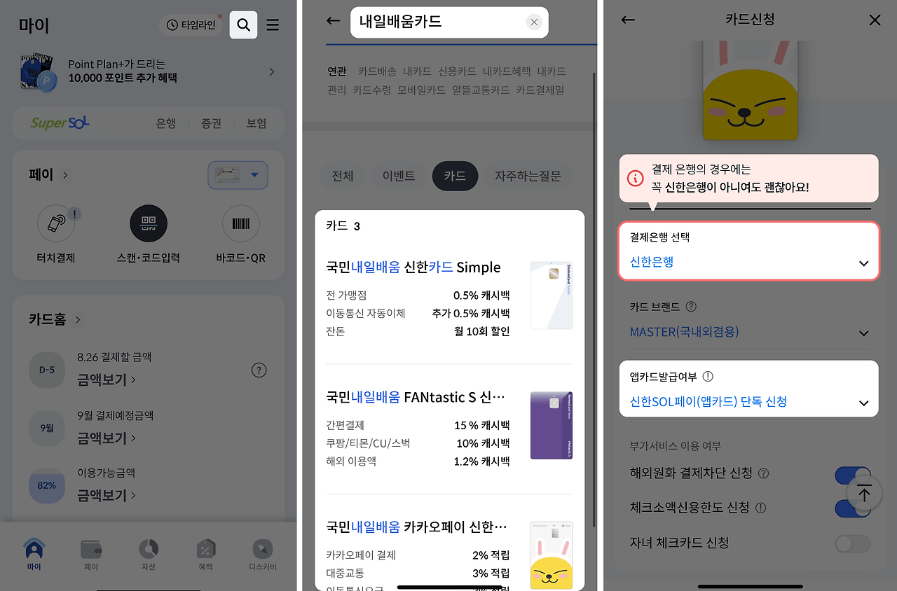 카드를 수령한 후 신한SOLPay 앱에 카드를 등록해 주세요. 앱에 카드를 등록하는 방법은 위에 안내된 내용과 동일합니다.📌 은행 방문 또는 농협 카드를 선택했다면?