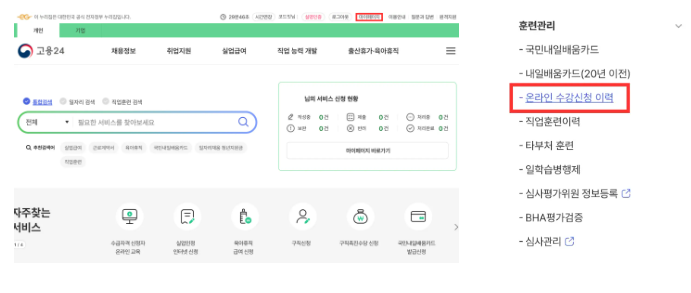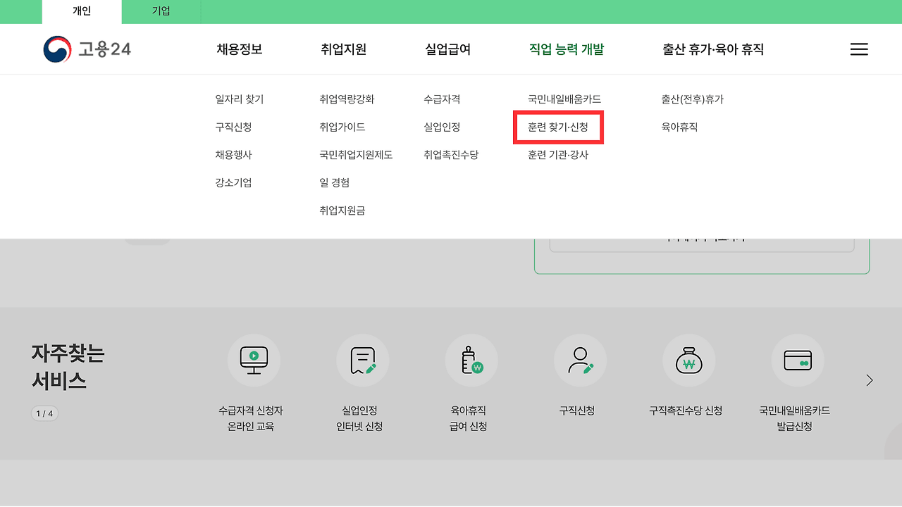 1. 고용24 상단 메뉴의 [직업 능력 개발] > [훈련 찾기・신청] 클릭